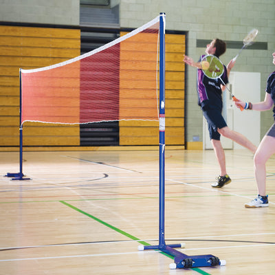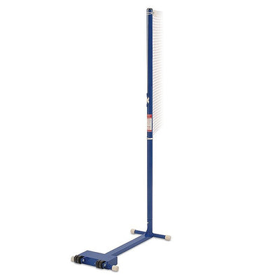 Uprights do not protrude into court area conforming to required safety standard.The "H" shaped bases have built-in weight and are fitted with rubber pads floor protection. Posts are attached to the base with a spring clip mechanism and can be easily detached for storage 1.55m high uprights made from 40mm diameter steel Uprights have a grooved top for the net headline and welded cleats wide double wheels are housed in extra strong fabricated brackets and will not mark or dent the floors.