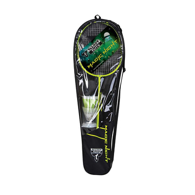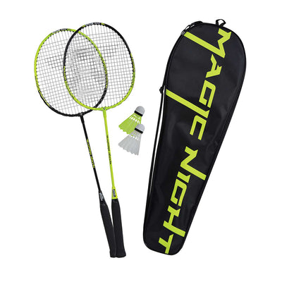The Talbot Magic Night Badminton Set is the new pack, that allows you to play badminton at night as well. This set features two sturdy rackets with hard-stretched, multifilament strings, a nylon carry bag that not only looks good, but it is also practical to be carried around with all you need to play in hand. And the absolute highlight in this set that is the LED shuttlecocks, sturdy plastic shuttlecocks with a switch for the LED lighting on the inside. The set includes a white ball that lights up green and a yellow shuttlecock that lights up the night in red. They both lasts for 48 hours each. The LED balls are equipped with a CR927 battery. The battery is not replaceable. Please do not dispose of with household waste.