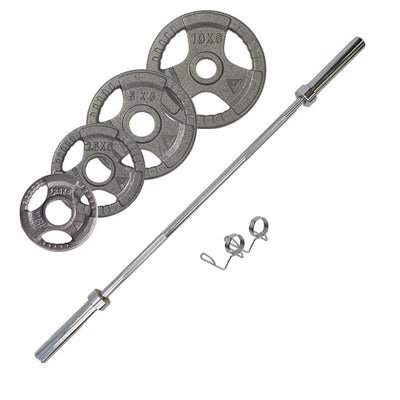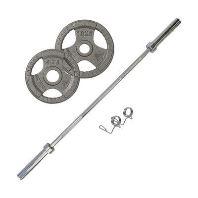 The shorter bar length makes it easier to manoeuvre in home gyms or tight spaces while still offering the stability of a standard Olympic bar sleeve. Each set includes durable cast iron tri-grip discs and secure spring collars for safe loading and quick plate changes.