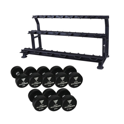 Hit Fitness Round Dumbbell Bundle: the ultimate dumbbell workout solution. This package includes 8 pairs of commercial grade round rubber dumbbells and a durable dumbbell rack, providing everything you need for effective strength training at home.