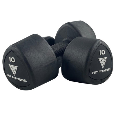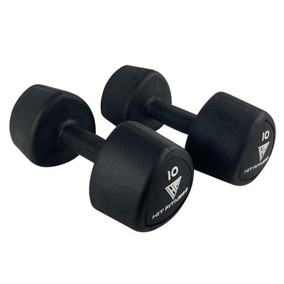 HIT Fitness studio dumbbells have been engineered and designed with studio classes and high-intensity interval training workouts in mind. These studio dumbbells are perfect for performing high repetitions and fast-paced resistance training or circuit training classes. Using dumbbells for these purposes has the added benefit of being easier on the joints as they can be moved in the individual athlete's preferred range of motion and dumbbell path. As these dumbbells will be repetitively used during high-intensity exercise classes, they are coated in durable, heavy-duty rubber. This protects the dumbbells themselves as well as the flooring, surrounding equipment and the individual who is using the dumbbells. These HIT Fitness studio dumbbells are built with highly durable materials which are encased with rubber which drastically improves the grip of the dumbbell's ergonomic handle structure as well. Studio dumbbells are also a brilliant addition to any studio exercise class because of their unique shape. This shape has been incorporated into these dumbbells so that users can use the dumbbells for support when performing exercises and it ensures that the dumbbells do not roll around the gym floor in between exercises and create a hazard.