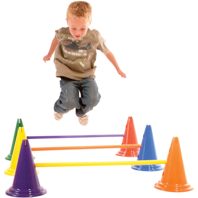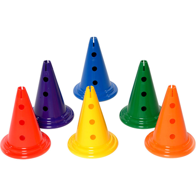 - Each cone has 3 holes down one side that allows PLAYM8 poles to be fixed between two cones to make jumping hurdles.