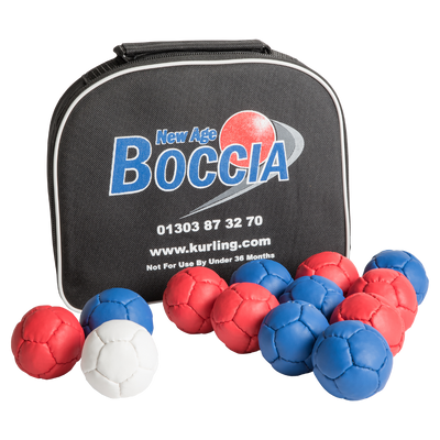The New Age Kurling Boccia Set is hand stitched and made from synthetic leather. Filled with plastic pellets these Boccia balls comply to competition standard with 6 red - 6 blue and a white jack - all in a carrying case.