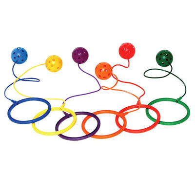 These PLAYM8 brightly coloured sets of leg skips are ideal for individual play while helping children to develop their coordination, fitness and agility. Simple to use and fun for all, simply place the Hoop around one ankle and swing the ball around in a circle and jump over the rope with your other leg. This can be done either on the spot or moving forward. Supplied as a set of 6, one of each colour: red, yellow, blue, green, orange and purple. PLAYM8 Leg Skips