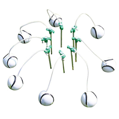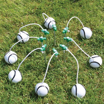 The eight sliotars can be secured to the ground in several formations allowing coaches, teachers etc to develop proper striking by pupils. The sliotars are held in fixed positions, eliminating wasted time retrieving, and possibly losing balls. Each set contains eight sliotars on cords and pegs, mallet, peg puller, instructions and carry bag.