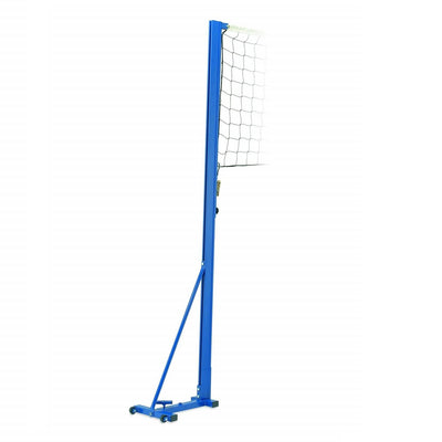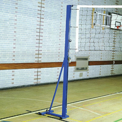 The volleyball posts feature a wheelaway steel base which does not protrude into the court. The uprights are made from 75mm x 50mm heavy-duty aluminium which is powder coated blue.