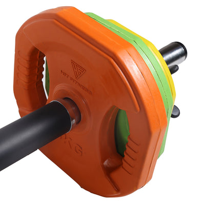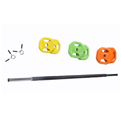The Hit Fitness Pump Set is a great piece of home gym equipment for any level of exercise skill. 6 plates come with the bar to make up to 20kg maximum, meaning this piece can be used for a wide range of exercises including curls, shoulder press, floor press, front raise, thrusters and so many more. Ergonomically designed, the bar has a rubber feel on the touchpoints allowing it to feel comfortable when performing front squats, back squats, thrusters, and hip thrusters.