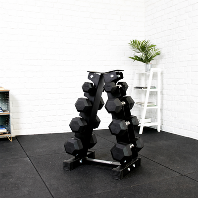 The sturdy rack securely holds your dumbbells, keeping them neatly organised and easily accessible for your workouts. Its design is tailored exclusively for hex dumbbells, making it a practical and durable addition to any home or commercial gym.