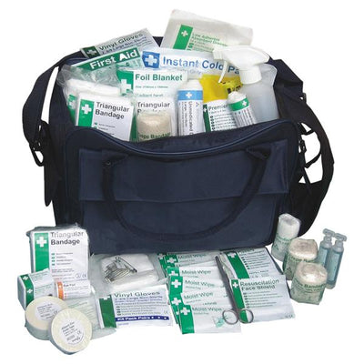 Approved by several County Football Associations. Ideal for football teams as well as general sports first aid applications.Supplied in a water-resistant run on bag (1 main compartment with 3 outer pockets). Contains all of the items needed to treat a minor injury on the playing field. Includes bandages, sterile wound dressings, sterile eyewash and waterspray bottles.
