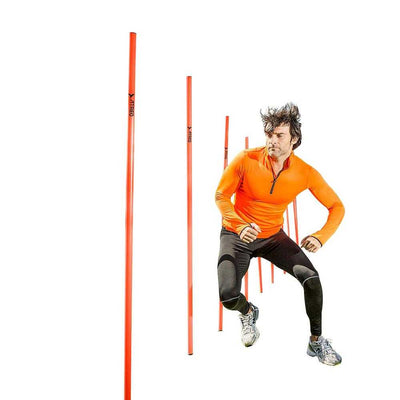 Hard wearing high-quality slalom poles used in a variety of ways to improve speed, agility and balance. Develops sidestep and evasion skills and can be used indoors or on astroturf with the Atreq Slalom Pole Base. The bright orange high visibility poles can be easily inserted into the ground featuring an aluminium spike. Supplied as a pack of 12 with carry bag.
