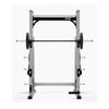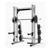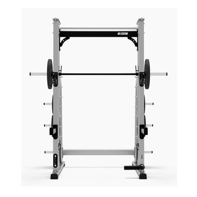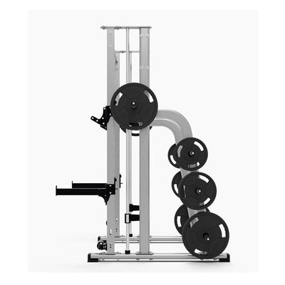 The Exigo Plate Loaded Power Smith is a combination of a Smith Machine and Power Rack that allows you to perform multiple exercises safely in a small area without losing any core features and affecting performance – ideal where space is a premium. This machine ensures smooth operation and easy adjustments using high quality linear bearings for its precision bar. It features swing lock J-Hooks with multiple catch positions and adjustable safety stops. Also included is a pair of fully adjustable/removable J-Hooks, 6 weight plate storage horns and an integrated pull up bar. Optional attachments such as a dip attachment, safety spot arms, a battle rope anchor, and a Landmine can also be added.