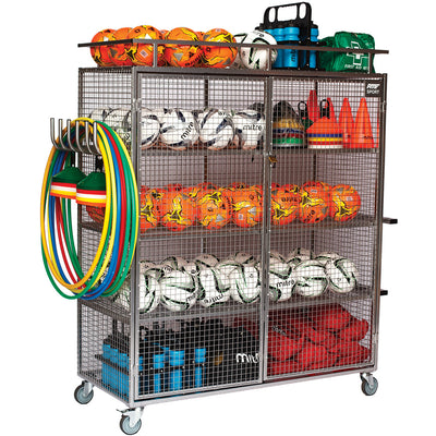 - Includes hooks for hoops and skipping ropes, an extra top shelf plus a stand that can hold up to 12 javelins