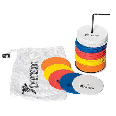 Set of 50 small mixed colour rubber marker discs from Precision Training with the non-slip backing grid on the metal stand. It includes 5 different colours and a carry bag.